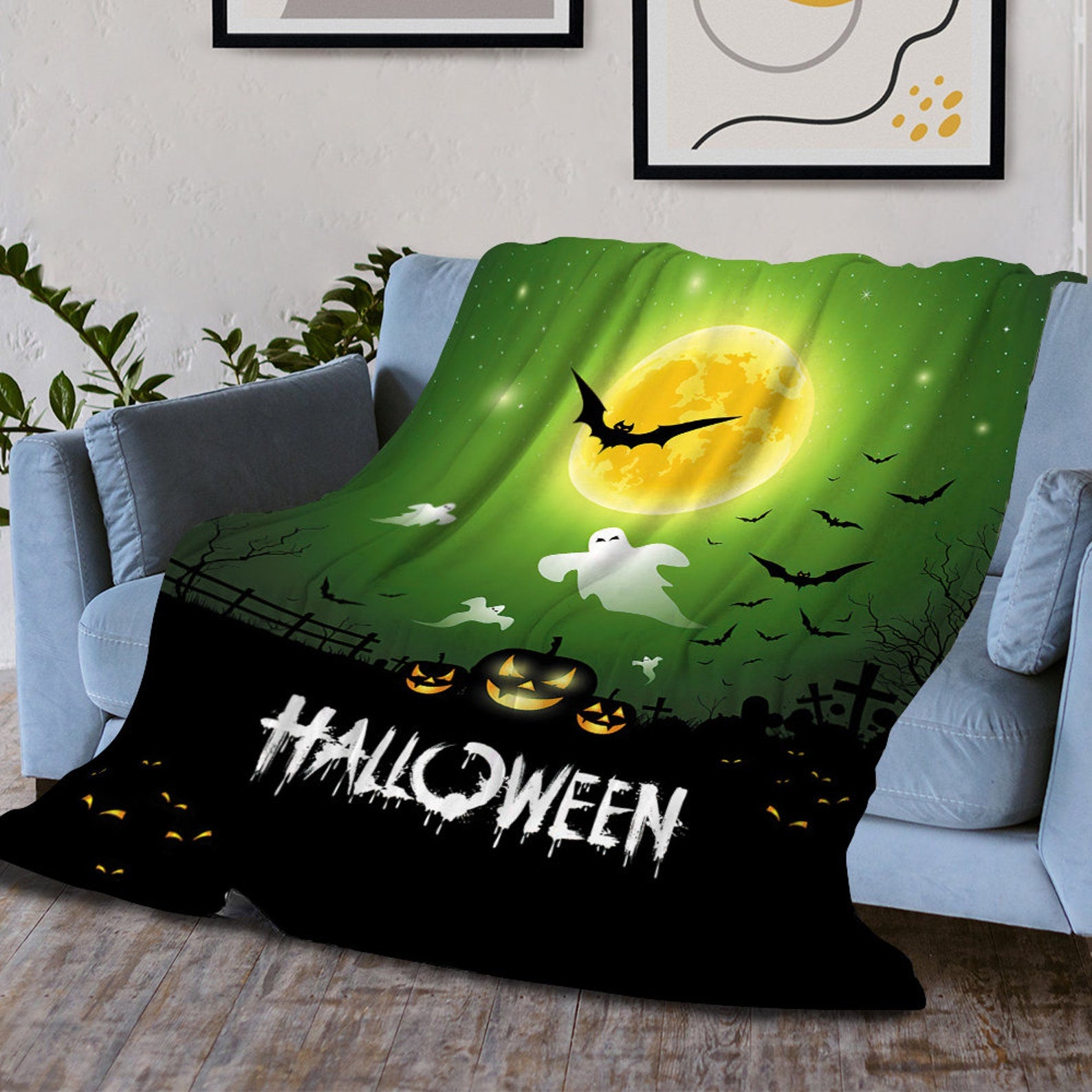 Halloween Blanket, Pumpkin Blanket, Bat Blanket, Spider Blanket, Halloween Home Decor, Green Black Blanket Gift